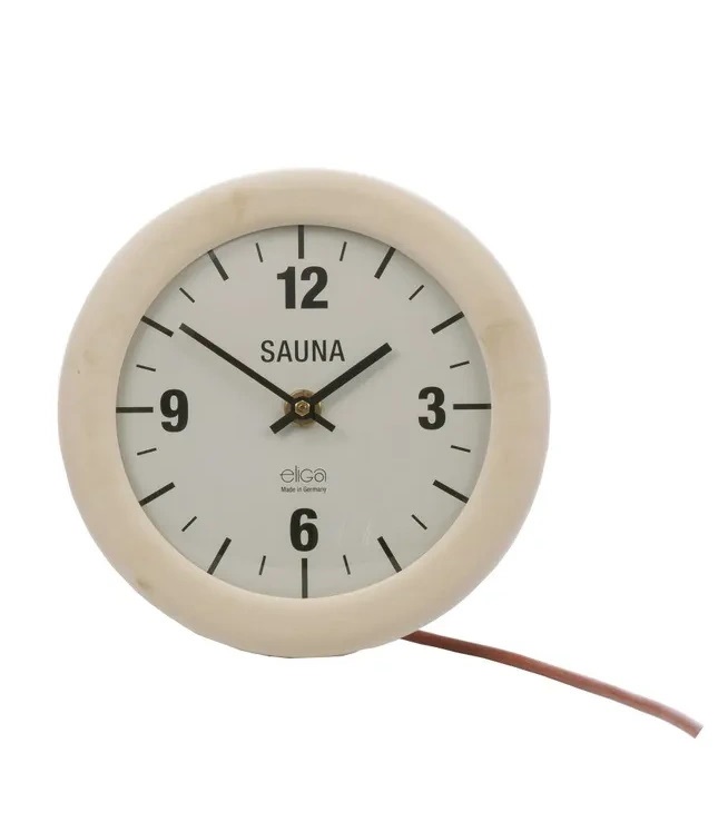 Elektrické hodiny do sauny jsou vybaveny speciálním synchronizačním mechanismem. Mohou být instalovány přímo do sauny díky trvalé odolnosti vůči teplotám do 120 °C. Jsou bezúdržbové a zasazené do dřevěného rámu.