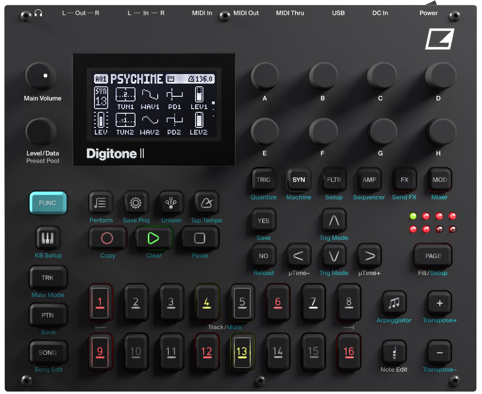 Syntezátor Elektron Digitone II je evolučním nástupcem oblíbeného FM syntezátoru Elektron, který nyní nabízí zejména rozšířenou polyfonii, vyšší výkon a počet stop, mnohem širší možnosti syntézy, včetně filtrů a efektů a ještě lepší kreativní ovládání. Digitone II je multitimbrální polyfonní syntezátor, který vám poskytne modulární workflow v kompaktním desktop formátu. Jeho 16 stop (oproti původním 8) lze použít pro libovolný syntezátor nebo MIDI, přičemž pro syntezátory j