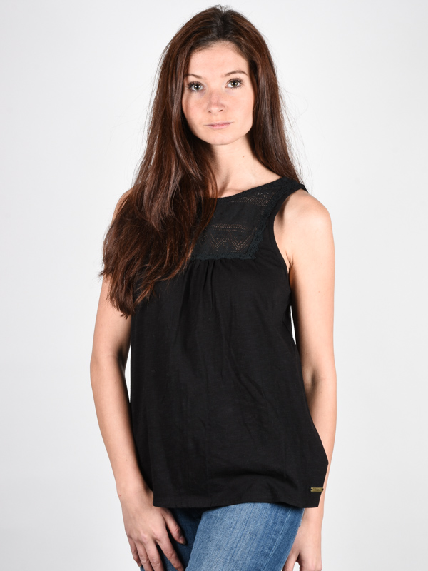 Černý dámský top Element Lucy Black hned s několika netradičními prvky. Tím prvním jsou knoflíčky na zadním dílu, tím druhým krajkový náplet u krku na přední straně. Tílko má ramínka a minimalistický kovový branding Element u spodního lemu.