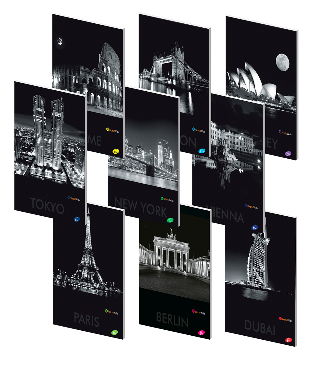 Působivé černobílé fotografie světových metropolí tvoří kolekci obalů kvalitních sešitů. Design obálky doplňuje efekt lesklých detailů. Výběr z 9 různých motivů.formát: A5, 40 listů, linkovanýgramáž: 80 g/m2obálka: matný povrch se zvýrazněnými lesklými detailyfotografie: 9 motivůvyrobeno: v EUobsah balení: 10 ks