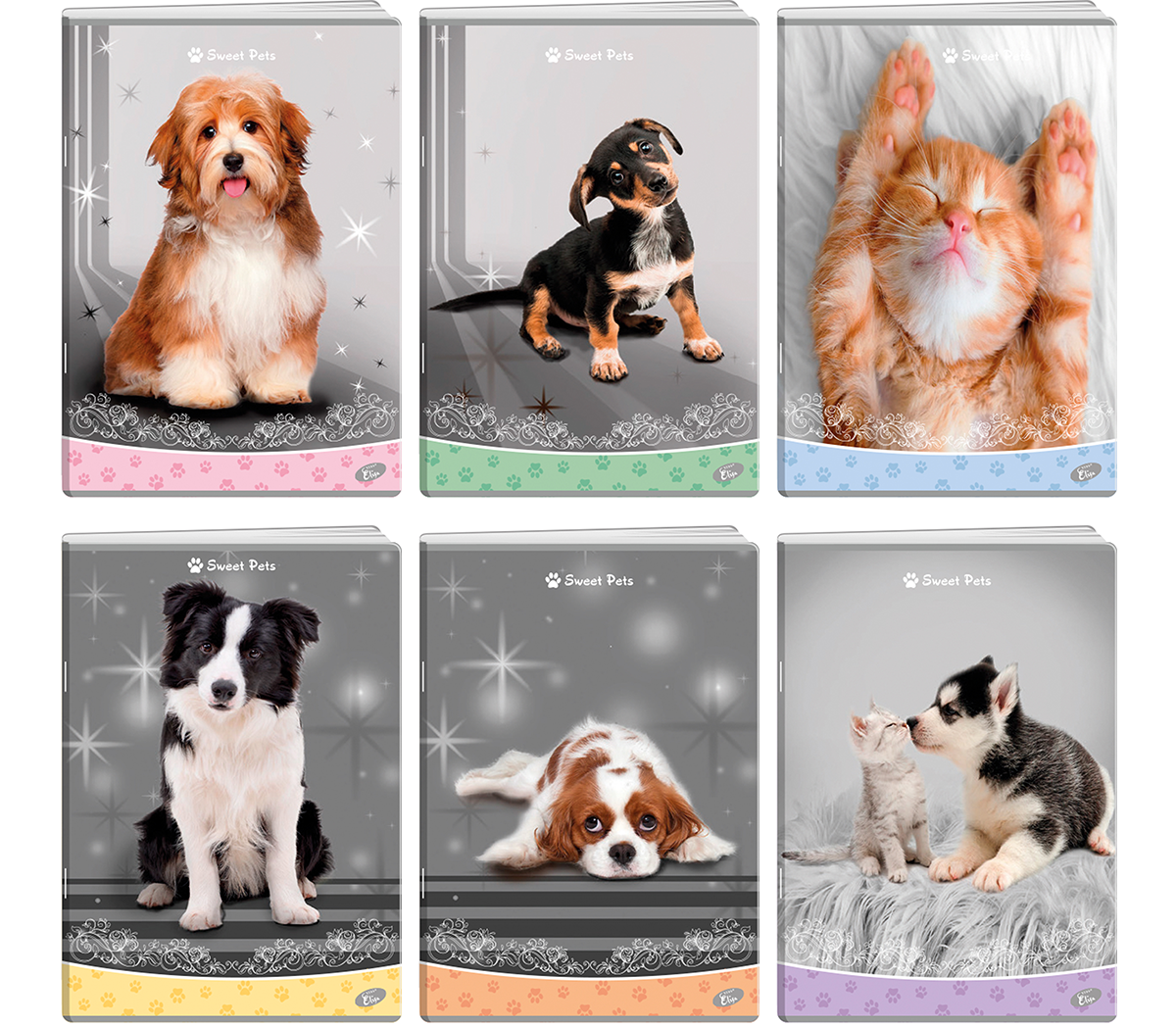 Fotografie šesti roztomilých mláďat domácích mazlíčků.formát: A5, 40 listů, linkovanýgramáž: 80 g/m2obálka: lesklá lakovaná obálkafotografie: 6 motivůvyrobeno: v EUobsah balení: 10 ks
