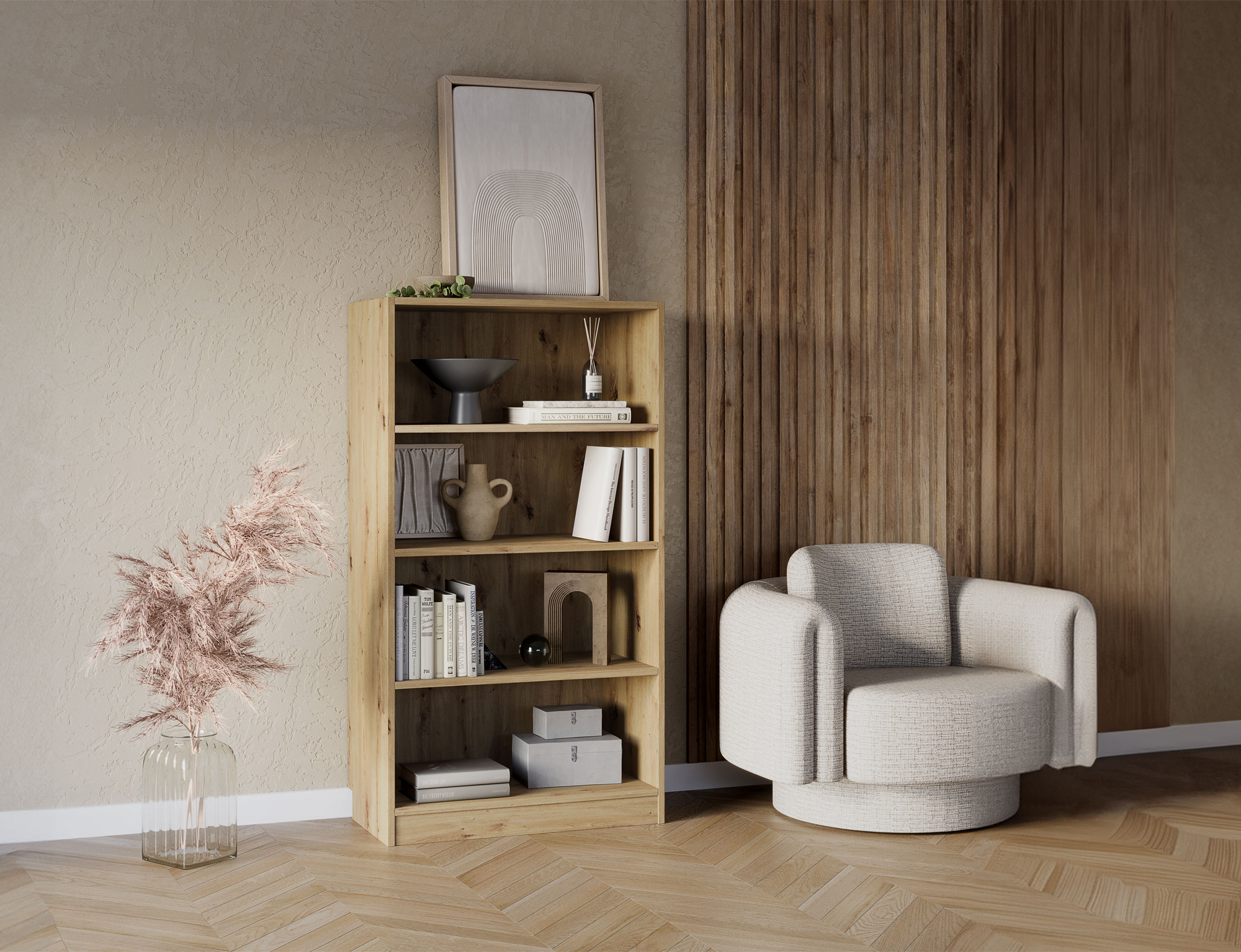 Regál Pocett Policový regál Pocett bude nedílnou součástí obývacího pokoje, ložnice nebo dětského pokoje. Díky policím budete mít nezbytné věci nejen vždy na očích, ale také v případě potřeby po ruce. Díky třem barevný variantám se bude hodit do všech interiérů. • Vlastnosti: Materiál Regál je vyroben z kvalitní laminované dřevotřískové desky o síle 16 mm. Zakončené hrany Hrany jednotlivých desek jsou opatřeny PVC lištou. Zadní stěna Na zadní stěnu je použita sololitová deska. Uchycení ke stěně Díky kovovým plíšků regál snadno uchytíte ke stěně, nemusíte se tak bát případného pádu regálu. • Barevné varianty Regál Pocett je vyroben v odstínech dub artisan, v bílé nebo černé barvě. Dub artisan Bílá Černá • Rozměry 146 cm celková výška 80 cm celková šířka 40 cm celková hloubka 16 mm tloušťka desky • Umístění regáluRegál se stane nedílnou součástí vašeho každodenního života, ať už bud umístěn v kanceláři, obývacím pokoji, předsíni, šatně nebo v dětské pokojíčku. •