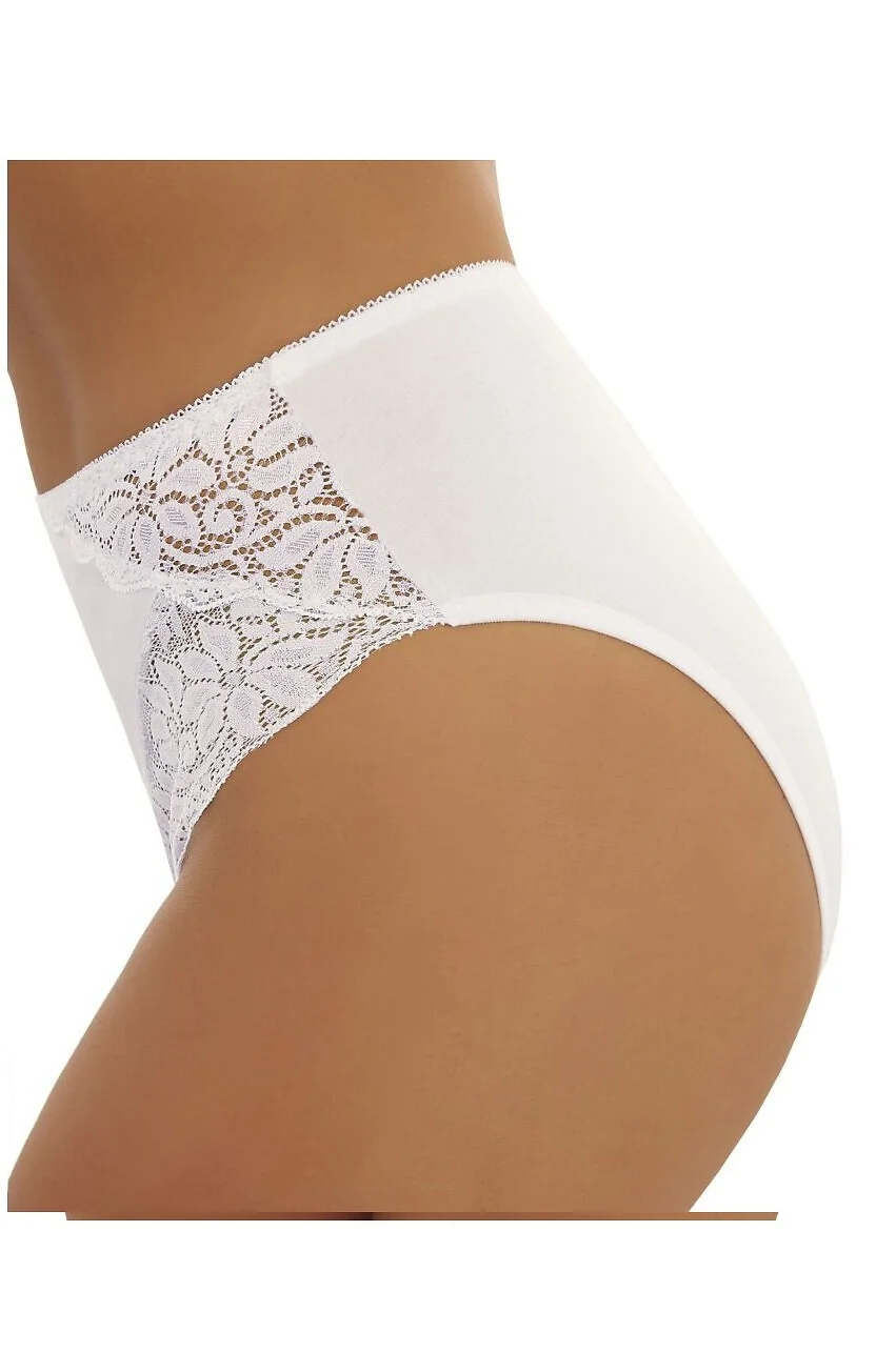 Dámské kalhotky - vysoká linie pasu - vypracované boky - z hladké bavlny v kombinaci s ažurovou krajkou Materiál: 92 % bavlna, 8 % elastan; krajka 88 % polyamid, 12 % elastan