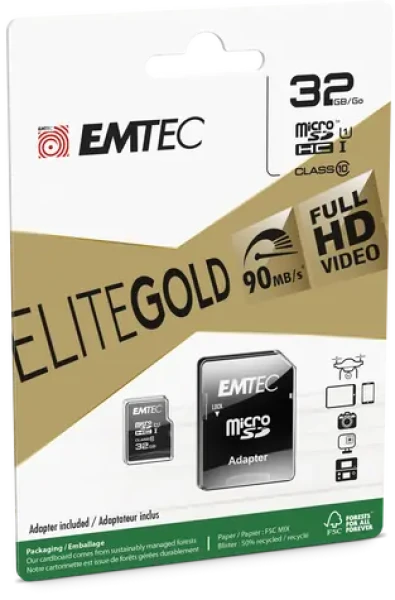 EMTEC Elite Gold micro SDHC karta 32GB + adaptér SD / Class 10 / čtení: 90MBs / zápis: 20MBs / vhodné pro FullHD