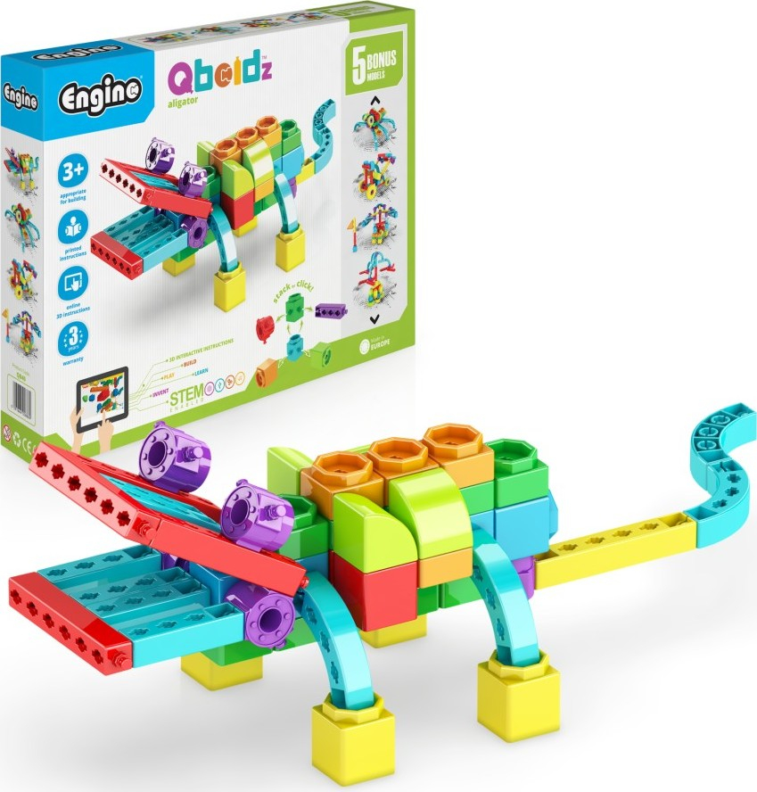 Stavebnice Engino Qboidz Aligátor je navržena speciálně pro předškolní děti od 3 let a nabízí pět různých modelů k sestavení, které podporují kreativitu i rozvoj motorických a kognitivních dovedností. Díky jasným a pestrým barvám jednotlivých dílků je stavebnice vizuálně atraktivní a snadno přitahuje pozornost malých objevitelů. Součástí balení je kromě tištěného návodu také přístup k interaktivní mobilní aplikaci Engino kidCAD®, která umožňuje prohlížet modely ve 3D a krok po kroku pomáhá s jejich sestavováním. Stavebnice obsahuje různé typy dílků, včetně bloků, kol a speciálních zakřivených prvků, které umožňují sestavení nejen zvířátek, jako je aligátor či pavouk, ale také autíček nebo katapultu. Díky tomu se děti mohou naučit základům konstrukce a mechaniky, přičemž jednotlivé modely jsou vzájemně kompatibilní i s ostatními stavebnicemi Engino. Díky jednoduchému systému zacvakávání dílků je manipulace snadná a bezpečná i pro malé děti. Balení stavebnice je pevné a přehledné, na přední straně je vyobrazena nejatraktivnější sestava aligátora, která přímo láká k tvorbě. Na zadní straně pak nechybí ukázky všech pěti modelů včetně různých variant a doplňků, což podporuje dětskou představivost a zvyšuje zájem o stavění. Výrobek je vyrobený v rámci EU na Kypru, což zaručuje vysokou kvalitu a bezpečnost použitých materiálů. Celkově stavebnice Engino Qboidz Aligátor představuje vzdělávací hračku, která děti nejen zabaví, ale také podpoří jejich rozvoj v oblasti STEM (věda, technologie, inženýrství a matematika) již od útlého věku. Kombinace fyzické stavby s digitálním návodem v aplikaci je moderním přístupem k učení a zábavě zároveň.