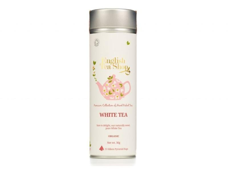 Bílý čaj bio kvalitě plechové dózičce praktických pyramidkách od značky English Tea Shop vás překvapí jemnou chutí a dodá vám energii díky obsaženému teinu. Je vhodný pro chvíli relaxace a praktickou plechovou dózičku můžete opětovně použít. Bílý čaj má lahodnou čistou chuť a obsahují antioxidanty, které zpomalují stárnutí. Má jemně zelenou barvu a velmi lehkou a svěží chuť, která má povzbuzující účinky. Bílý čaj se zpracovává z mladých nerozvinutých lístků, které se suší na slunci. English Tea Shop nabízí čistě přírodní čaje bez syntetických příchutí a barviv. English Tea Shop nese certifikáty bio, fairtrade a veškerý obalový materiál i samotné čajové sáčky jsou biologicky odbouratelné a recyklovatelné. Jejich výroba je zcela bezuhlíková. Složení: bílý čaj**Bio a Fairtrade. Příprava: Čajový sáček zalijte 0,2 l vody o teplotě 70 °C a nechte louhovat 3-4 minuty. Poté podle chuti oslaďte. Tip: Bílý čaj můžete připravit i jako ledový nápoj. Země původu: Cejlon. Obsah: 30 g, 15 pyramidek, 1 plechovka
