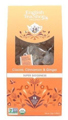 Čaj Kakao, skořice a zázvor v bio kvalitě od značky English Tea Shop má štiplavou, kořeněnou a sladkou chuť. Díky praktickému balení si čaj můžete vychutnat kdekoliv a kdykoliv. Čaj je zcela bez kofeinu.Skořice má prohřívací účinky a pomáhá regeneraci pokožky. Kakao posiluje organismus a funguje jako afrodiziakum. Fenykl osvěžuje dech. Zázvor je příjemným doplňkem směsi díky své pikantní chuti. Složení: skořice (45%)*, kakao (35%)*, fenykl (15%)*, zázvor (5%)**Bio Hmotnost: 30 gBalení obsahuje 15 pyramidek