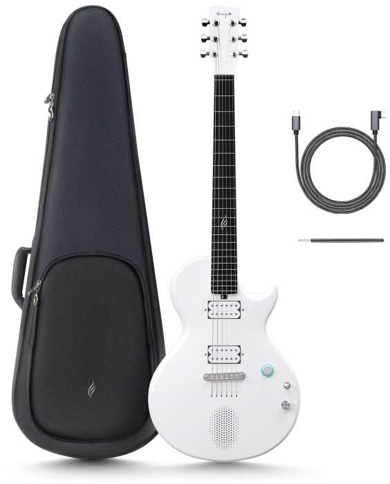 Elektrická designová smart kytara - materiál: uhlíková vlákna, Enya ES1Pro Smart Audio System, snímače: 2x Enya Custom Dual Coil Pickup, vestavěná baterie 2600 mAh, reproduktor: 10 W, příslušenství (gig bag, nabíjecí kabel, nástrojový kabel, klíč), barva: White
