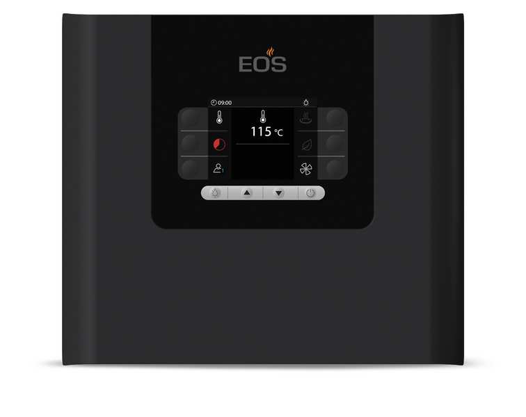 Elektronická řídicí jednotka EOS Compact DP v antracitové barvě pro finskou (suchou) saunu je vysoce praktická a skvěle vypadá. Zajistí jednoduché, intuitivní ovládání díky multifunkčním tlačítkům a velkému barevnému displeji.