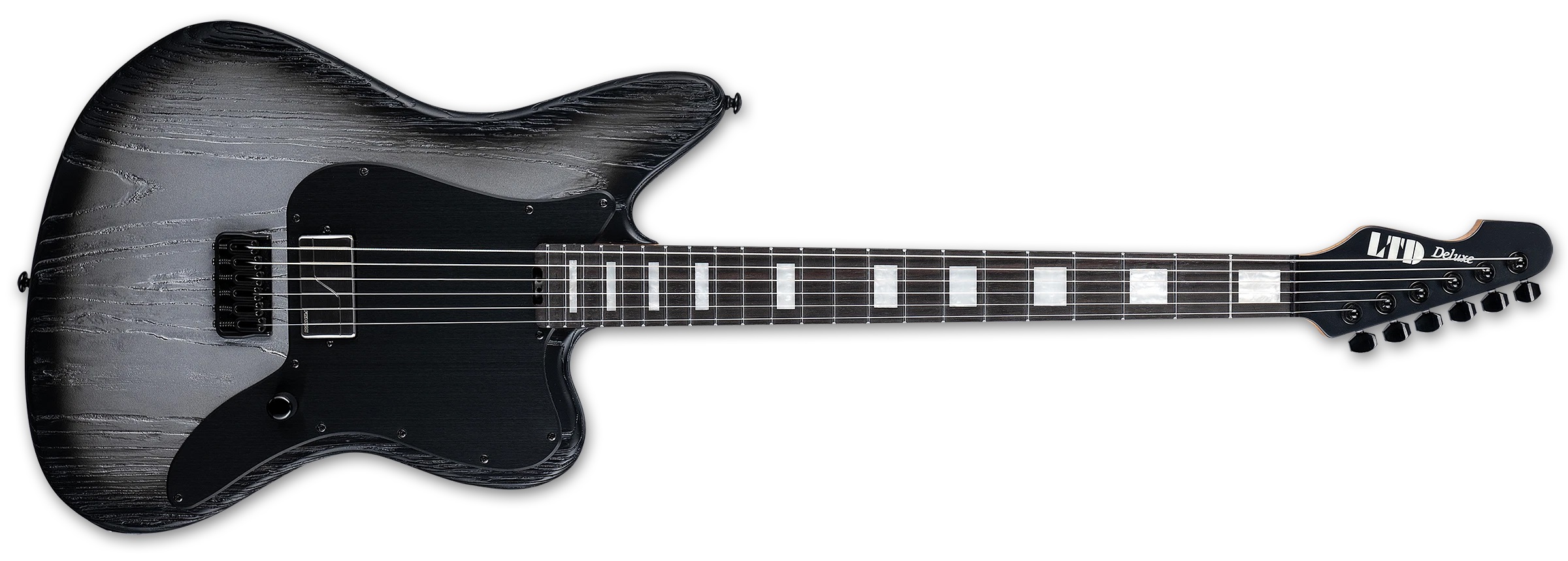 Elektrická barytonová kytara Elektrická kytara XJ-1 Baritone Silver Blast s elegantním offset tvarem těla je součástí řady LTD Deluxe, která představuje to nejlepší z produkce LTD. Zvuk, design, zpracování a herní vlastnosti nástrojů z této série plně obstojí i ve srovnání s dražšími „high-end“ kytarami. Jedná se o barytonovou kytaru s delší menzurou (686 mm) běžně laděnou do H/B, tj. podobně jako sedmistrunné kytary. Tělo kytary je zhotoveno z bahenního jasanu, jehož kresbu zvýrazňuje texturovaný pískovaný