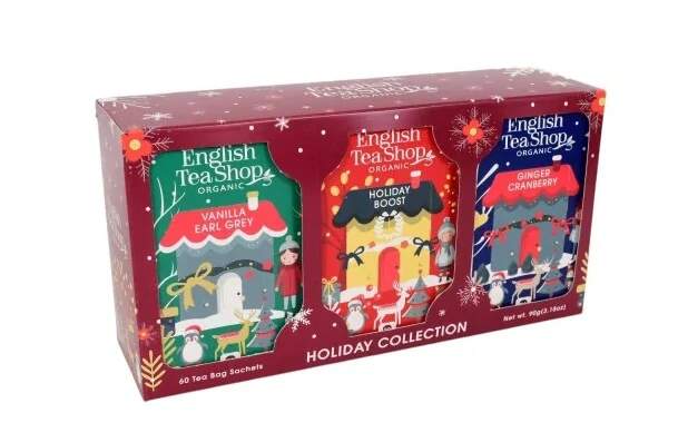 3 druhy vánočních čajů s kořením, ovocem a bylinkami v luxusním dárkovém balení Vanilka a Earl Grey Složení: černý čaj bio (85.5%), citronová kůra bio (8.5%), přírodní a bio příchuť vanilky (3.5%), přírodní a bio příchuť bergamotu (1.5%), vanilka bio (0.5%), okvětní plátky růže bio (0.5%). (Doba louhování: 3-4 minuty). Sváteční Nakopnutí Složení: šípek bio (38%), ibišek bio (24%), listy máty peprné bio (10%), jablka bio (8%), skořice bio (7.5%), lékořice bio (7%), přírodní příchuť manga (2.5%), přírodní příchuť skořice (1.5%), přírodní příchuť vanilky (1%), plátky růže bio (0.5%). - Obsahuje lékořici Zázvor Brusinky Složení: černý čaj bio (69%), skořice bio (22%), přírodní příchuť malin (4%), hřebíček bio (3%), přírodní příchuť vanilky (1%), zázvor bio (0.5%), brusinky bio (0.5%). 3x20 sáčků