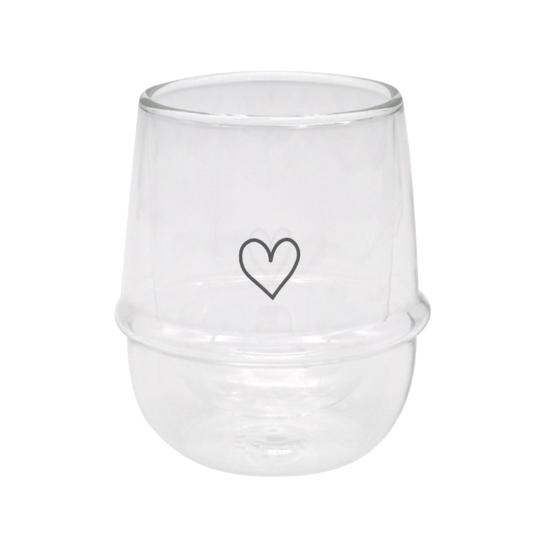 Sklenička má mírně rozevírající se tvar a je bez ouška. Místo toho ji obíhá vystouplý prstenec. Ten zajišťuje jak komfortní úchop, tak ojedinělý vzhled. Nedílnou součástí je decentní dekor v podobě srdce, které je vyobrazeno tenkou černou linkou. Dvojité sklo pak vytváří úchvatný levitující efekt a současně zastává i termoizolační funkci - nápoj by si měl o něco déle udržet svoji teplotu.