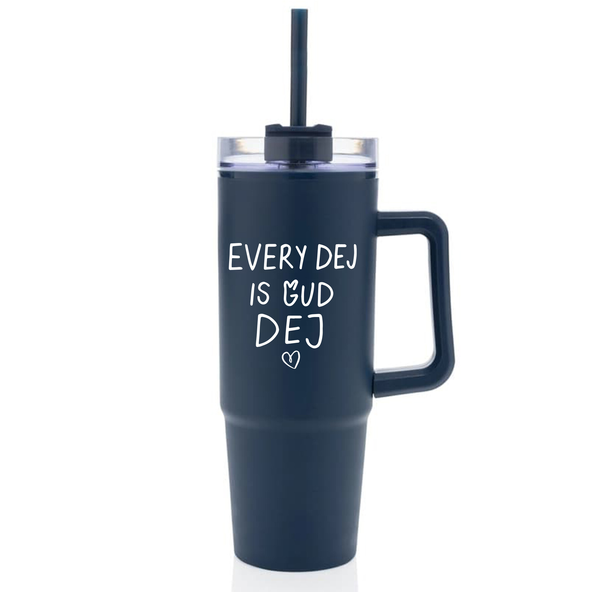 Cestovní hrnek s uchem "EVERY DEJ IS GUD DEJ" – 900 ml Tahle kráska není žádný roztomilý hrníček na dvě loknutí. 900 ml stylu, hydratace a energie pro každého. Elegantní cestovní hrnek s uchem a víčkem se slámkou ti umožní pít jako diva – ať už srkáš ranní kávu, ledové latté nebo limonádu u bazénu. Objem: 900 ml – skoro litr čisté síly (a stylu) Pohodlné ucho Víčko se slámkou Na výběr: černá, bílá, tmavě modrá, světle modrá, světle růžová, béžová Trefný potisk EVERY DEJ IS GUD DEJ 🌟 Pro všechny, které zvládají denní shon ve stylu – a s pořádnou dávkou kávy.