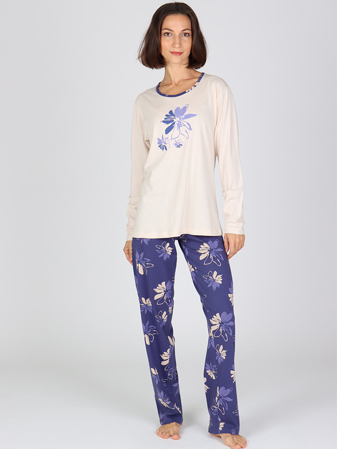 Dámské dlouhé pyžamo P EVELYN je perfektní volbou pro lenošení a klidný spánek. Toto pyžamo je z příjemné bavlny. dámské dvoudílné pyžamo je vyrobené ze 100% bavlny triko s dlouhým rukávem a potiskem kulatý výstřih zakončený lemováním kalhoty mají celoplošný potisk v pase kalhot je vyměnitelná pohodlná elastická guma toto bavlněné dámské pyžamo můžete použít i jako pohodlný domácí oděv Tip: Prohlédněte si naši nabídku dámského spodního prádla