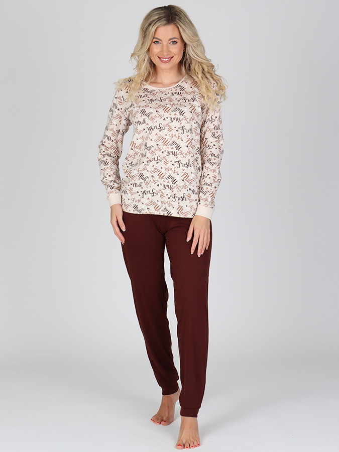 Dámské dlouhé pyžamo P NANCY je perfektní volbou pro lenošení a klidný spánek. Oceníte u něho náplety na rukávech a nohavicích. dámské dvoudílné pyžamo je vyrobené ze 100% Bavlny triko s dlouhým rukávem a celoplošným potiskem kulatý výstřih zakončený lemováním jednobarevné kalhoty náplety na rukávech a nohavicích v pase kalhot je vyměnitelná pohodlná elastická guma toto bavlněné dámské pyžamo můžete použít i jako pohodlný domácí oděv Tip: Prohlédněte si naši nabídku dámského spodního prádla
