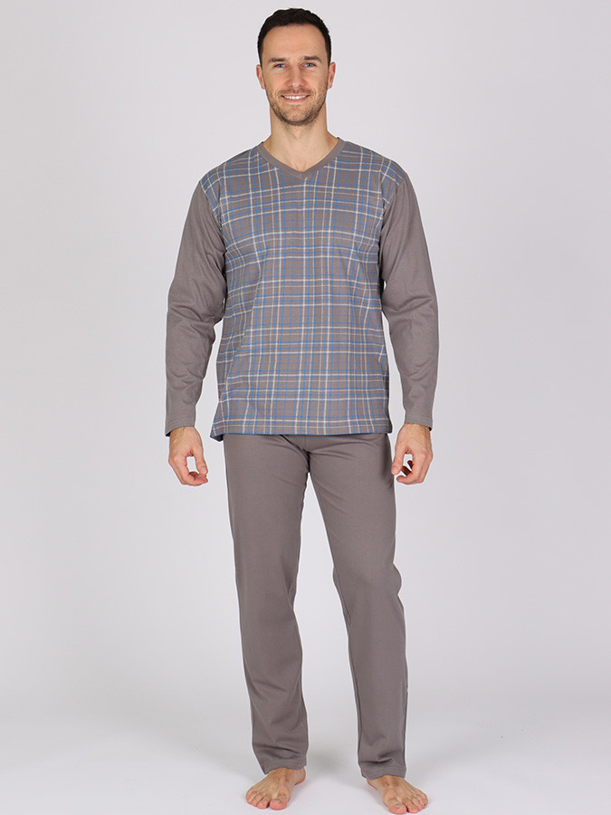 Pohodlné pánské dlouhé pyžamo P WIND z čisté bavlny je příjemné na tělo. Pyžamo se skládá z trika s károvaným potiskem a z jednobarevných kalhot s dlouhou nohavicí. Je ideální na chladnější roční období. Noční prádlo pro skvělý pocit. ze 100% Bavlny, která Vám poskytne příjemný pocit a pohodlí při spánku triko má výstřih do V a dlouhé rukávy jednobarevné kalhoty pyžamové kalhoty mají v pase pohodlnou elastickou gumu toto pánské pyžamo je ideální pro chladnější období model je vysoký 186 cm a má velikost L TIP: Prohlédněte si naši nabídku pánského spodního prádla