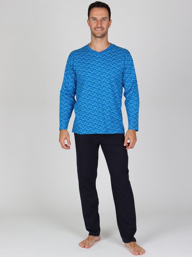 Pohodlné bavlněné pánské dlouhé pyžamo se skládá z trika s celoplošným potiskem a dlouhým rukávem a z dlouhých jednobarevných kalhot. ze 100% Bavlny, která Vám poskytne příjemný pocit a pohodlí při spánku triko má výstřih do V a celoplošný potisk pyžamové kalhoty mají v pase vyměnitelnou elastickou gumu, která zajistí vyšší komfort během nošení model je vysoký 186 cm a má velikost L Tip: Prohlédněte si naši nabídku pánského spodního prádla.