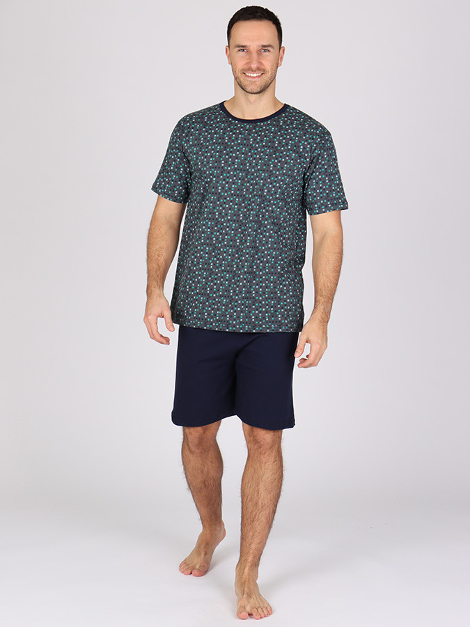 Pohodlné bavlněné pánské krátké pyžamo P FEST z čisté bavlny si oblíbite. Skládá se z trika s potiskem a jednobarevných krátkých kalhot. Toto pyžamo skvěle poslouží i jako dárek! ze 100% Bavlny, která Vám poskytne příjemný pocit a pohodlí při spánku triko má kulatý výstřih a krátké rukávy triko s potiskemn jednobarevné kalhoty krátké pyžamové kalhoty mají v pase všitou elastickou gumu, která zajistí vyšší komfort během nošení model je vysoký 186 cm a má velikost L Tip: Prohlédněte si naši nabídku pánského spodního prádla.