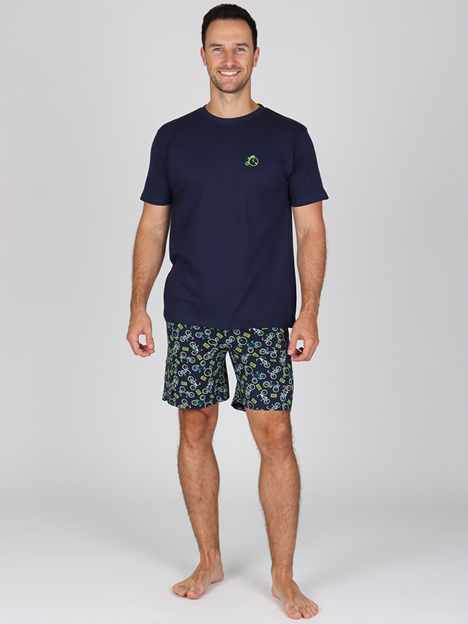 Pánské krátké pyžamo P LEON si zamilují všichni milovníci kol. Pohodlné bavlněné pánské krátké pyžamo se skládá z trika s drobným potiskem a krátkých kalhot s potiskem. Toto pyžamo skvěle poslouží i jako dárek! ze 100% Bavlny, která Vám poskytne příjemný pocit a pohodlí při spánku triko má kulatý výstřih a krátké rukávy originální potisk na tričku a krátké kalhoty s potiskem krátké pyžamové kalhoty mají v pase všitou elastickou gumu, která zajistí vyšší komfort během nošení model je vysoký 186 cm a má velikost L Tip: Prohlédněte si naši nabídku pánského spodního prádla.