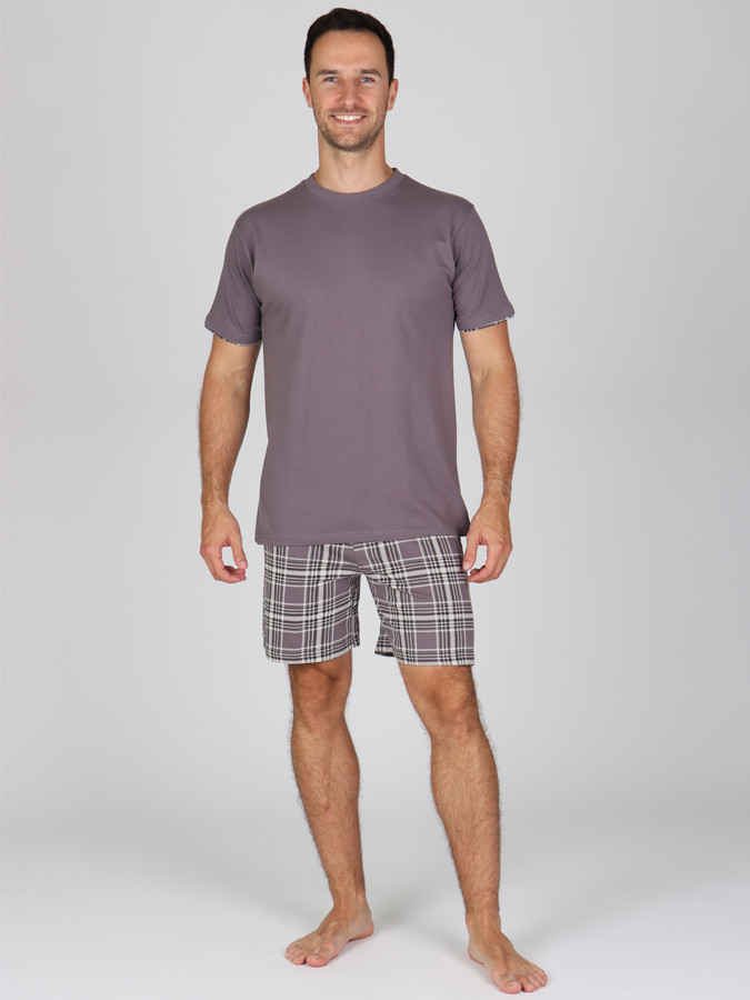 Pohodlné bavlněné pánské krátké pyžamo se skládá z jednobarevného trika a z potištěných krátkých kalhot. Na rukávech je dvojitý ozdobný lem. ze 100% bavlny, která Vám poskytne příjemný pocit a pohodlí při spánku triko má kulatý výstřih a krátké rukávy zakončené dvojitým lemem kraťasy s károvým potiskem krátké pyžamové kalhoty mají v pase vyměnitelnou elastickou gumu, která zajistí vyšší komfort během nošení Tip: Prohlédněte si naši nabídku pánského spodního prádla.