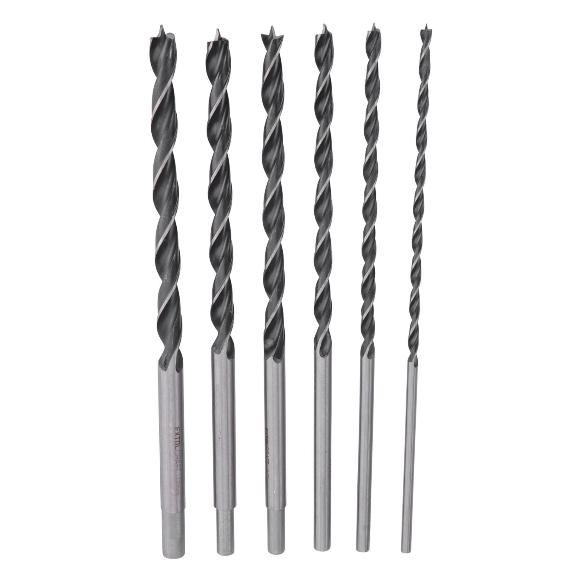 Sada vrtáků do dřeva se speciálně broušenou špičkou. Tyto vrtáky se používají na vrtání vysoce přesných děr v měkkém i tvrdém dřevu, dřevovláknitých a dřevotřískových materiálech. Dvojitá šroubovice zaručuje vysoký výkon a dlouhou životnost vrtáku. Sada je dodávána v praktickém plastovém boxu, který usnadňuje manipulaci a skladování. Každý vrták má své označené místo a odpadá tak zdlouhavé hledání potřebného rozměru. Počet vrtáků v sadě:6Průměry vrtáků:6 - 8 - 10 - 12 - 13 - 14 mmDélka vrtáků:300 mmUpínací stopka:válcováExtra:-