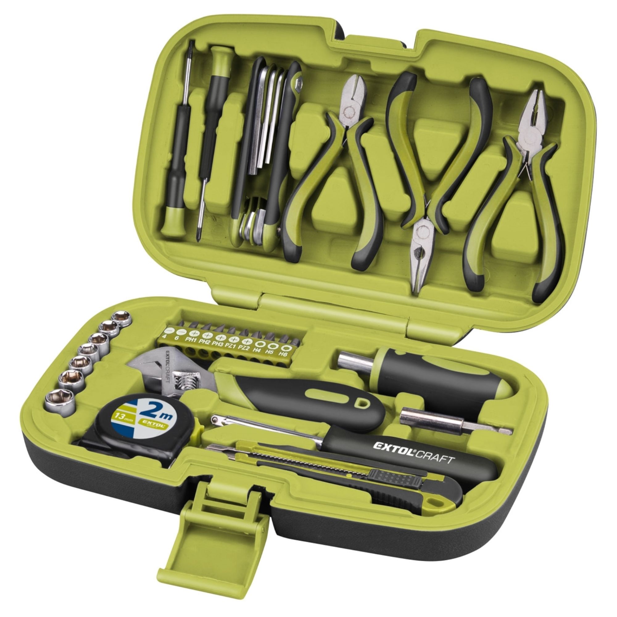 Sada nářadí se širokým spektrem použití. Bohatá kombinace nejpoužívanějších kleští, šroubováků a gola klíčů. Díky svému složení je sada vhodná zejména na domácí použití. Sada je v plastovém kufru pro snadné skladování a přenášení. Počet dílů:35Šroubováky:2 ks + šroubovák na bity + šroubovák na golaKleště:3 ksKlíče:7 ks IMBUS (1,5 - 6 mm)Kladivo:-Gola:7 ks hlavic (5 - 11 mm) + 1 ks nástavců (1/4")Bity:10 ks + adaptér na bityExtra:metr, stavitelný klíč, nůžKufr:ANO
