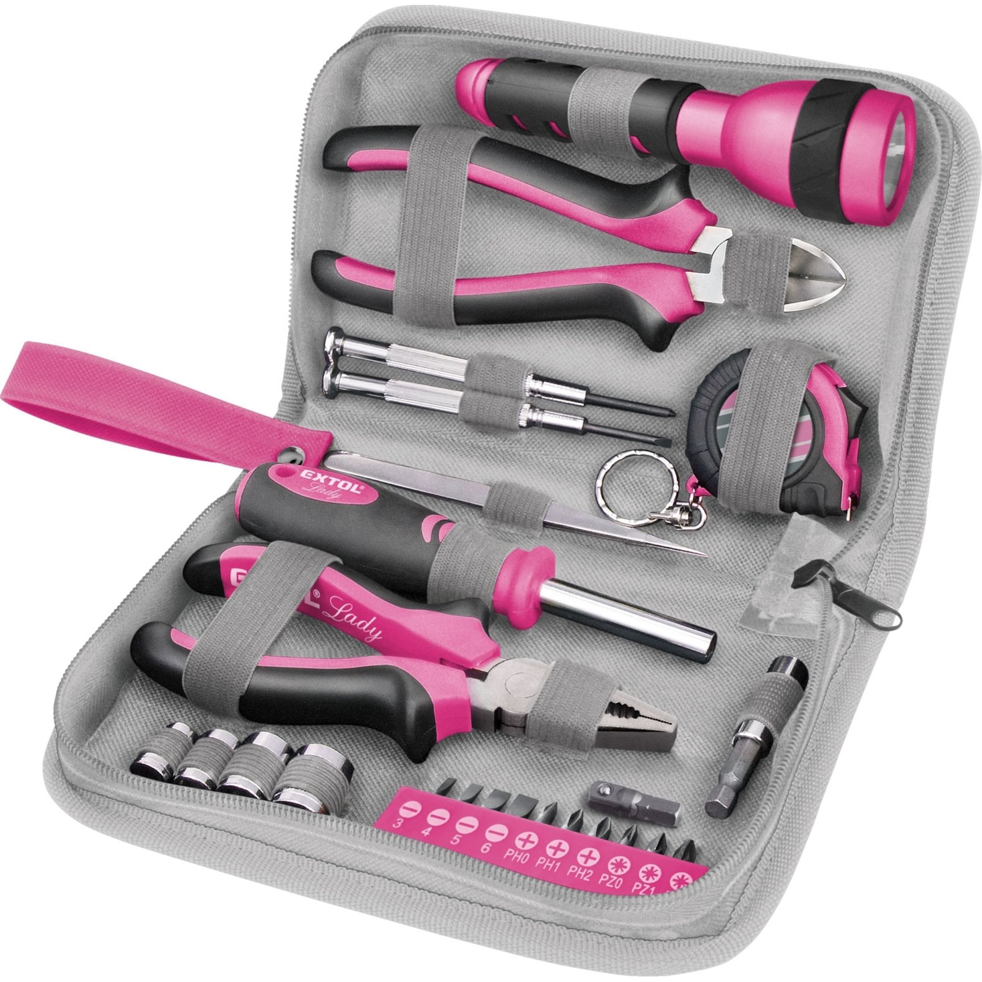 Praktická sada nářadí pro běžné domácí opravy a práce laděná do růžové barvy. Sada obsahuje nejpoužívanější nářadí pro běžnou práci jako jsou šroubováky, kleště, metr a jiné. Celá sada je dodávána v praktickém a odolném textilním pouzdře. Tento usnadňuje skladování a manipulaci. Máte doma zručnou přítelkyni, manželku, maminku, babičku. Určitě by ocenila nářadí, které na první pohled patří pouze jí. Počet dílů:23Šroubováky:2 ks + šroubovák na bityKleště:2 ksKlíče:-Kladivo:-Gola:1 ks ráčna + 4 ks hlavic (6 - 13 mm) (1/4")Bity:10 ksExtra:metr, baterka, adaptér na hrotyKufr:ANO