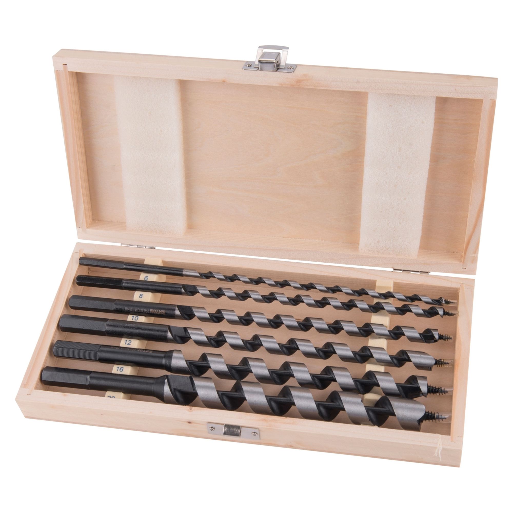 Sada hadovitých vrtáků do dřeva se speciální řeznou špičkou. Tyto vrtáky se používají na vrtání vysoce přesných děr v měkkém i tvrdém dřevu. Speciální šroubovice zaručuje dobrý odvod materiálu.Sada je dodávána v praktické dřevěné kazetě, která usnadňuje manipulaci a skladování. Každý vrták má své označené místo a odpadá tak zdlouhavé hledání potřebného rozměru.Počet vrtáků v sadě:6Průměry vrtáků:6 - 8 - 10 - 12 - 16 - 20 mmDélka vrtáků:260 mmUpínací stopka:šestihranExtra:dřevěný box