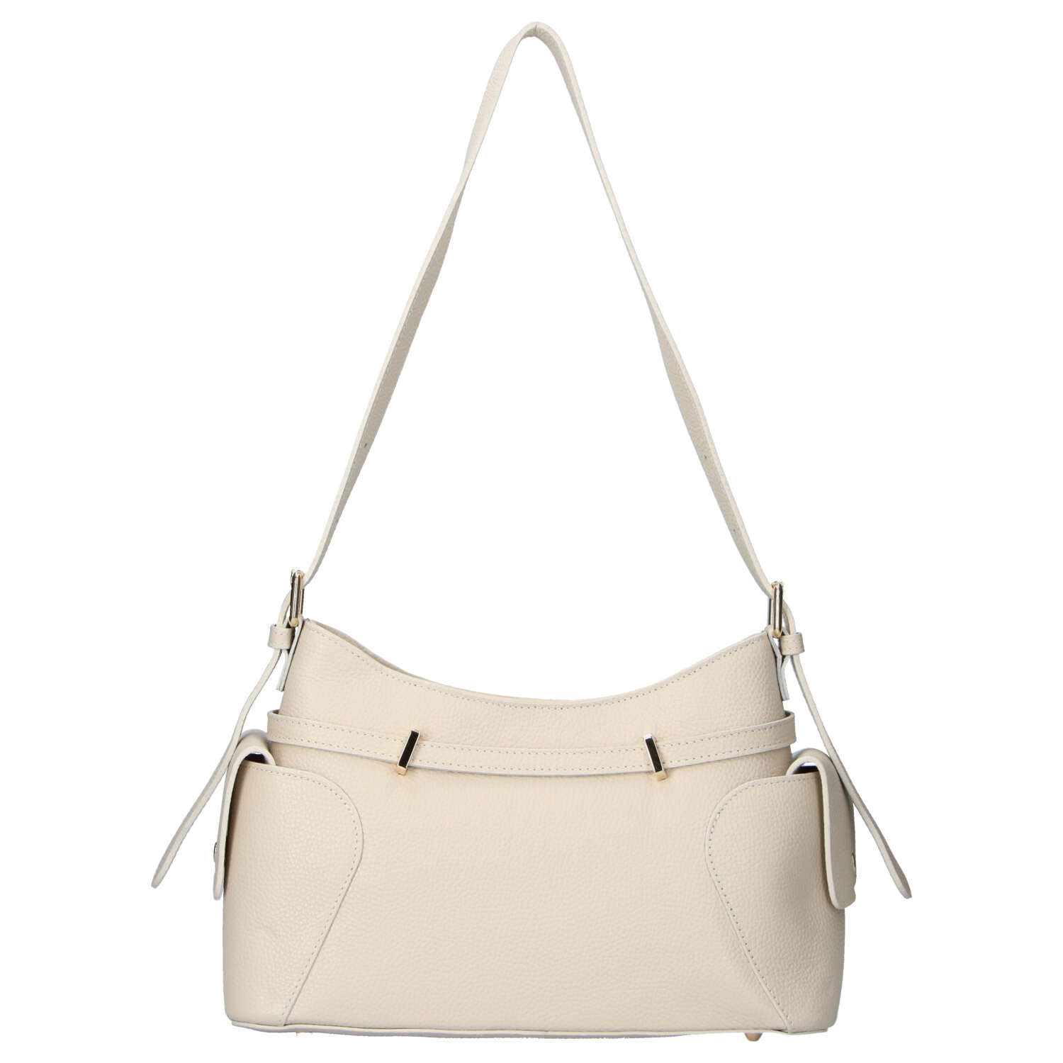Moderní kožená kabelka s ležérně elegantním vzhledem, která skvěle doplní každodenní outfit. Je vyrobena z kvalitní kůže s jemnou texturou, díky které působí sofistikovaně a zároveň odolně. Design oživují stylové pásky s kovovými detaily na přední straně, které dodávají kabelce osobitý charakter. Nastavitelný popruh umožňuje pohodlné nošení přes rameno.