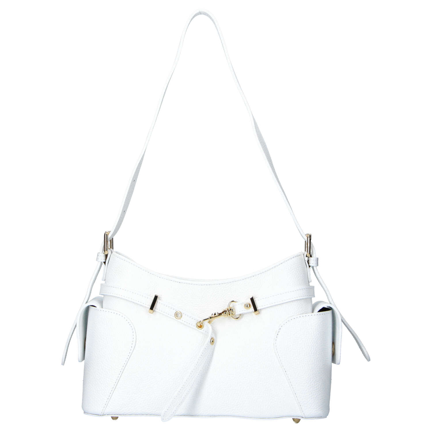 Moderní kožená kabelka s ležérně elegantním vzhledem, která skvěle doplní každodenní outfit. Je vyrobena z kvalitní kůže s jemnou texturou, díky které působí sofistikovaně a zároveň odolně. Design oživují stylové pásky s kovovými detaily na přední straně, které dodávají kabelce osobitý charakter. Nastavitelný popruh umožňuje pohodlné nošení přes rameno.