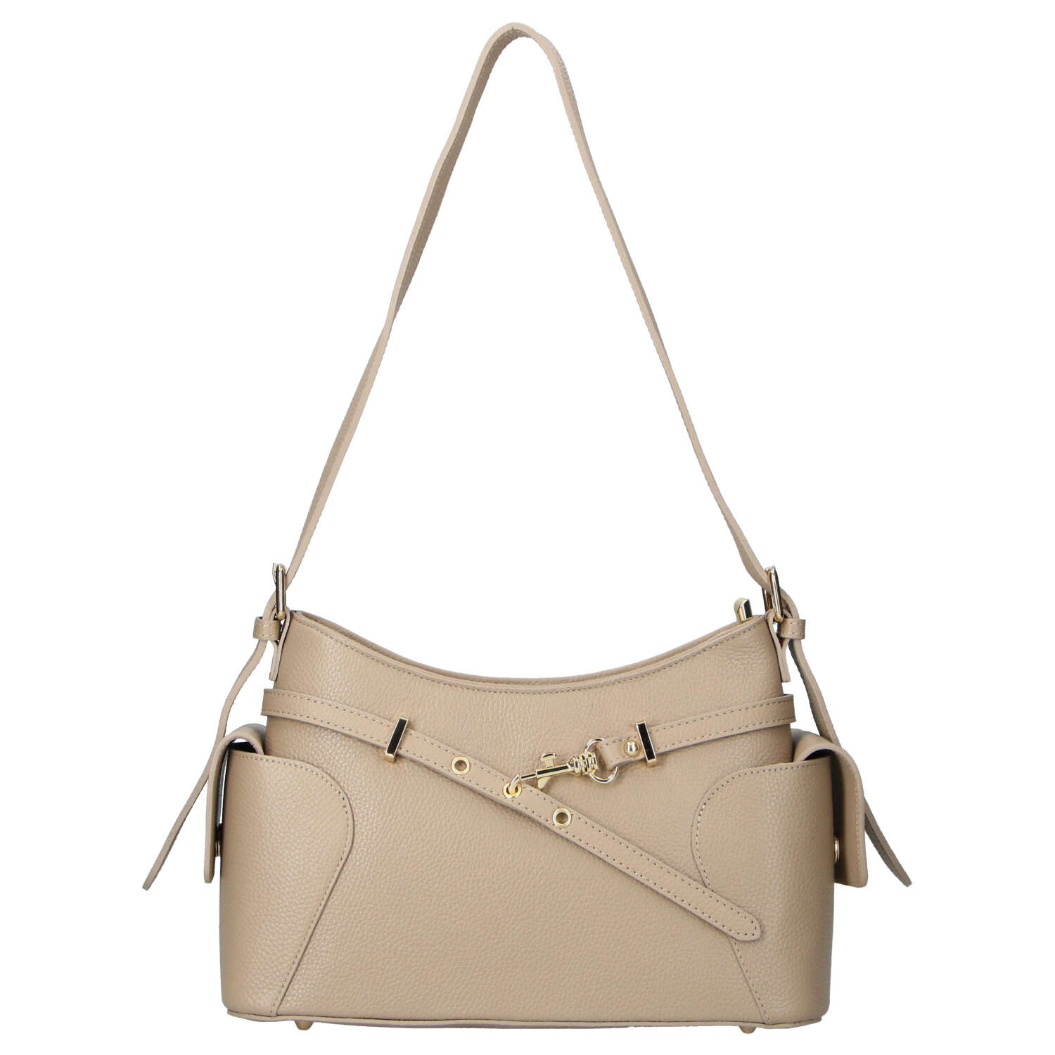 Moderní kožená kabelka s ležérně elegantním vzhledem, která skvěle doplní každodenní outfit. Je vyrobena z kvalitní kůže s jemnou texturou, díky které působí sofistikovaně a zároveň odolně. Design oživují stylové pásky s kovovými detaily na přední straně, které dodávají kabelce osobitý charakter. Nastavitelný popruh umožňuje pohodlné nošení přes rameno.