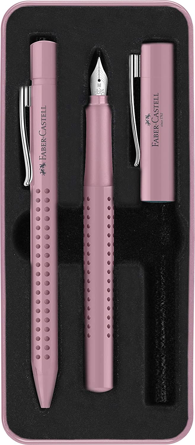Grip pera patří mezi velmi oblíbené produkty značky Faber-Castell. Patentované masážní body usnadňují držení psací pomůcky a tím i psaní. Každý rok přichází firma na trh s novou barvou Grip výrobků. Pro rok 2021, je touto barvou růžová, šedá a bílá. V kouzelné dárkové sadě, naleznete dvě růžová pera. Kuličkové pero (šíře hrotu 1 mm, šíře stopy 0,5 mm) je doplněno plnicím perem (šíře hrotu M), ve stejném designu. Společně tvoří neodolatelnou dvojku, která se bude skvěle vyjímat na pracovním stole i při soukromé korespondenci. Vše je uloženo v designové kovové kazetě, díky čemuž se sada hodí jako krásný dárek. V nabídce eshopu můžete zakoupit další pomůcky pro psaní perem: konvertor, který umožňuje používání inkoustu z lahvičky, různobarevné inkousty a také náhradní bombičky.