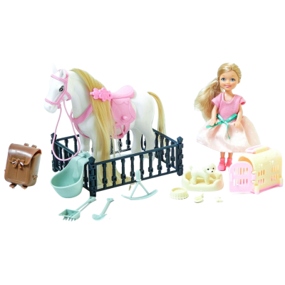 Součástí sady je koník, panenka, ohrada, pejsek, pelíšek a další doplňky. Výrobek je vhodný pro děti od 3 let.