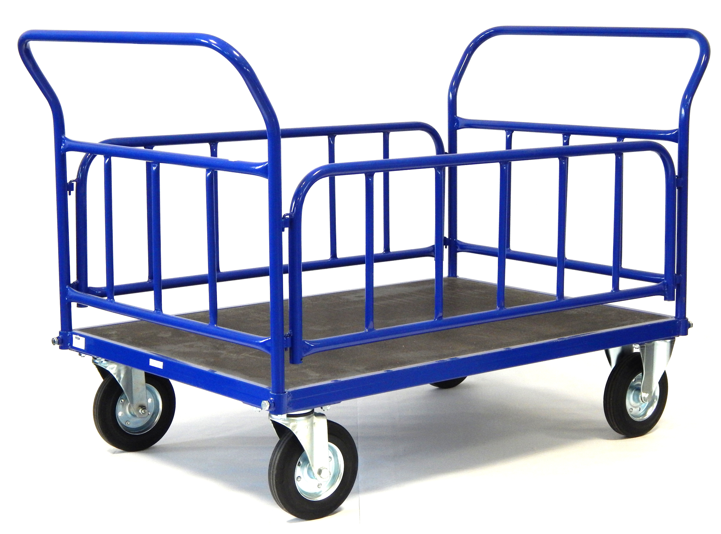 Přepravní (plošinový) vozík PVV je vhodný pro snadnou přepravu břemene na vodorovné plošině.Jízdu vozíku zajišťují dvě pevná a dvě otočná kola pro snadnou manipulaci. Výběr je ze tří druhů kol : 1. samonosná (pryžová) průměr 200 mm, kovový disk s jehličkovým ložiskem. 2. bantamová (foukací) průměr 260 mm, kovový disk s jehličkovým ložiskem. 3. samonosná AlG (pryžová), hliníkový disk s kuličkovým ložiskem - u těchto kol je nosnost vozíku 600 kg. Rozměr vozíku je 1200 x 8000 mm. Vozíky PVV jsou vyráběny ve dvou různých velikostech plošiny, vždy s dvěma variantami opor - dvě čela nebo ohrádka.