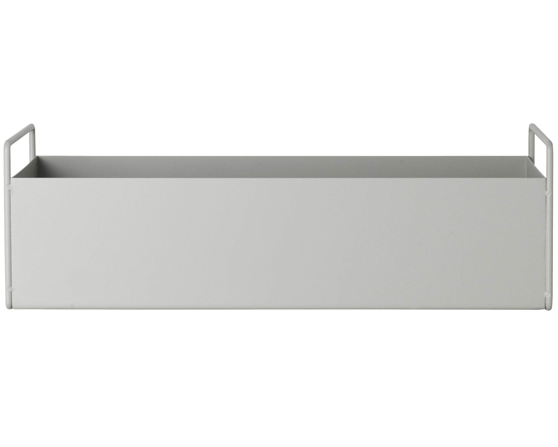 Je z kovového materiálu a má minimalistický vzhled s moderní světlounce šedivou barvou. Po stranách má praktické uši pro snadné přenášení. výška 14 cm / šířka 45 cm / hloubka 16,5 cm Vyrobeno z práškového lakovaného kovu.