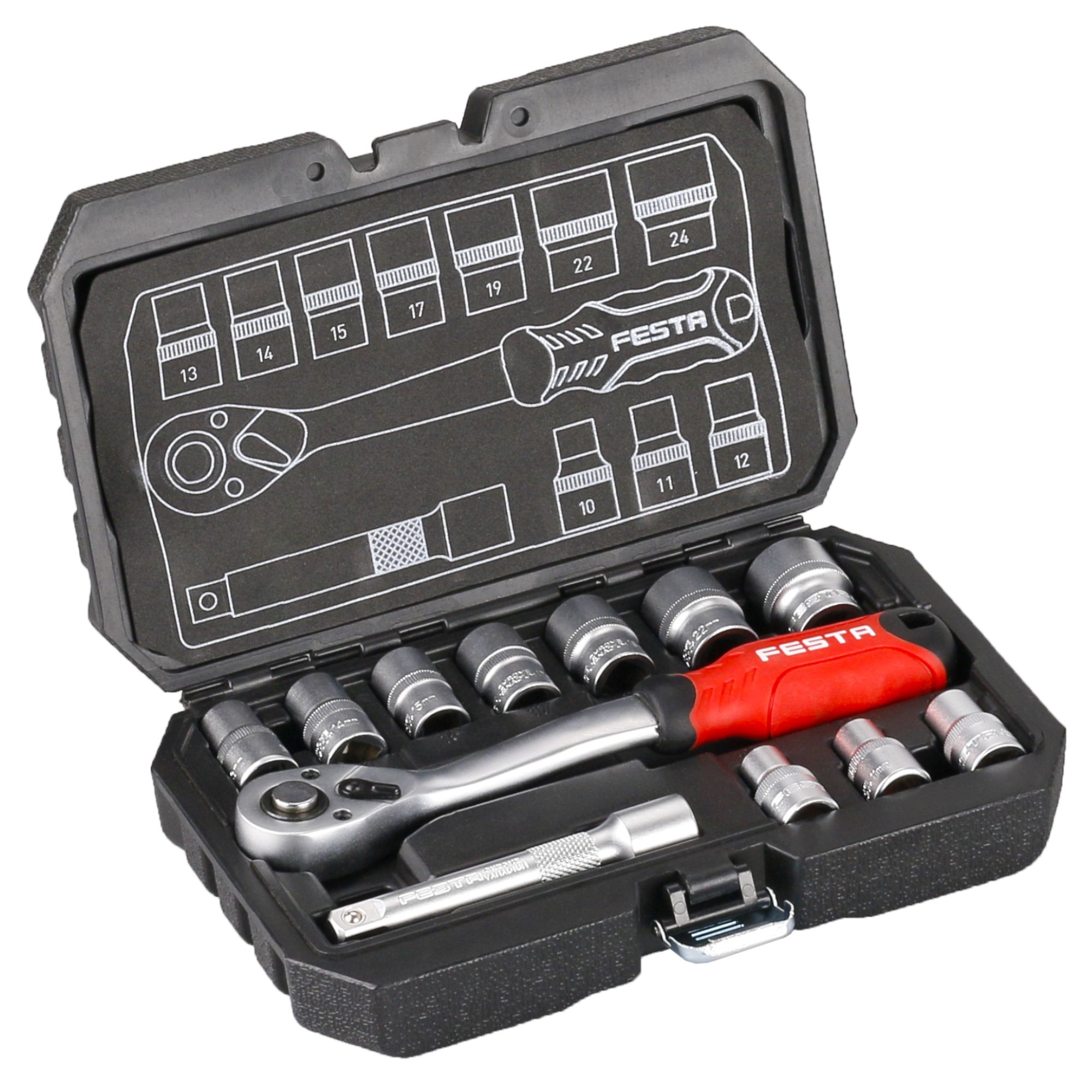 Velmi kvalitní gola sada pro použití v servise, dílně, garáži a pod.. Tato gola sada je vyrobena z odolných materiálů té nejvyšší kvality. Každá nástrčná i zástrčná hlavice je vyrobena kováním a to značně prodlužuje jejich životnost. Gola sada je dodávána v odolném plastovém kufru. To usnadňuje přepravu a skladování. Rozměr ráčny:1/2" / 72 zubůProdloužení 1/2":125 mmHlavice nástrčné 1/2":10 - 11 - 12 - 13 - 14 - 15 - 17 - 19 - 22 - 24 mm