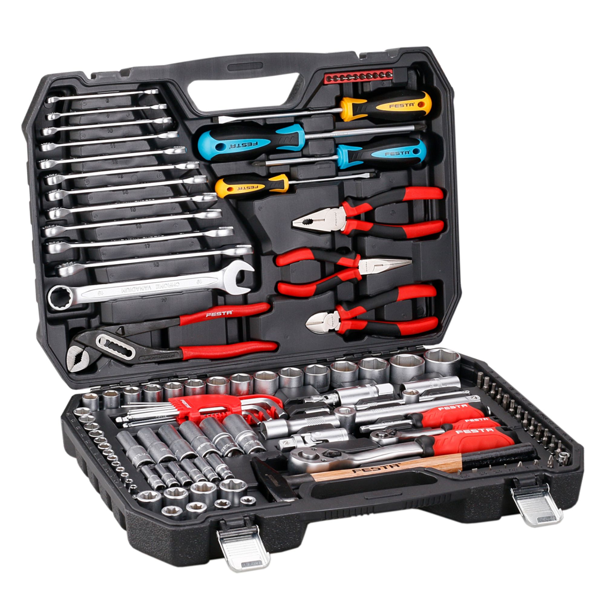 Kvalitní sada nářadí s opravdu širokým spektrem použití. V sadě naleznete téměř vše, co můžete doma, nebo v dílně potřebovat. Bohatá kombinace obsáhlé gola sady, nejpoužívanějších kleští, šroubováků, klíčů doplněná o zámečnické kladivo. Výborně se hodí i jako záložní sada do auta. Celá sada je v odolném plastovém kufru pro snadné skladování a přenášení.Počet dílů:122Šroubováky:4 ks + šroubovák na gola 1/4"Kleště:4 ksKlíče:12 ks očkoploché (8 - 19 mm) + 9 ks IMBUS (1,5 - 10 mm)Kladivo:300 gGola:2 ks ráčna (1/4" + 1/2") + 41 ks hlavic 1/4" (4 - 14 mm + PZ, PH, PL, TORX, IMBUS) + 29 ks hlavic 1/2" (10 - 32 mm + E10 - E24) + 2 ks klíče na svíčku + 2 ks nástavců (1/4" + 1/2")Bity:10 ksExtra:-Kufr:ANO