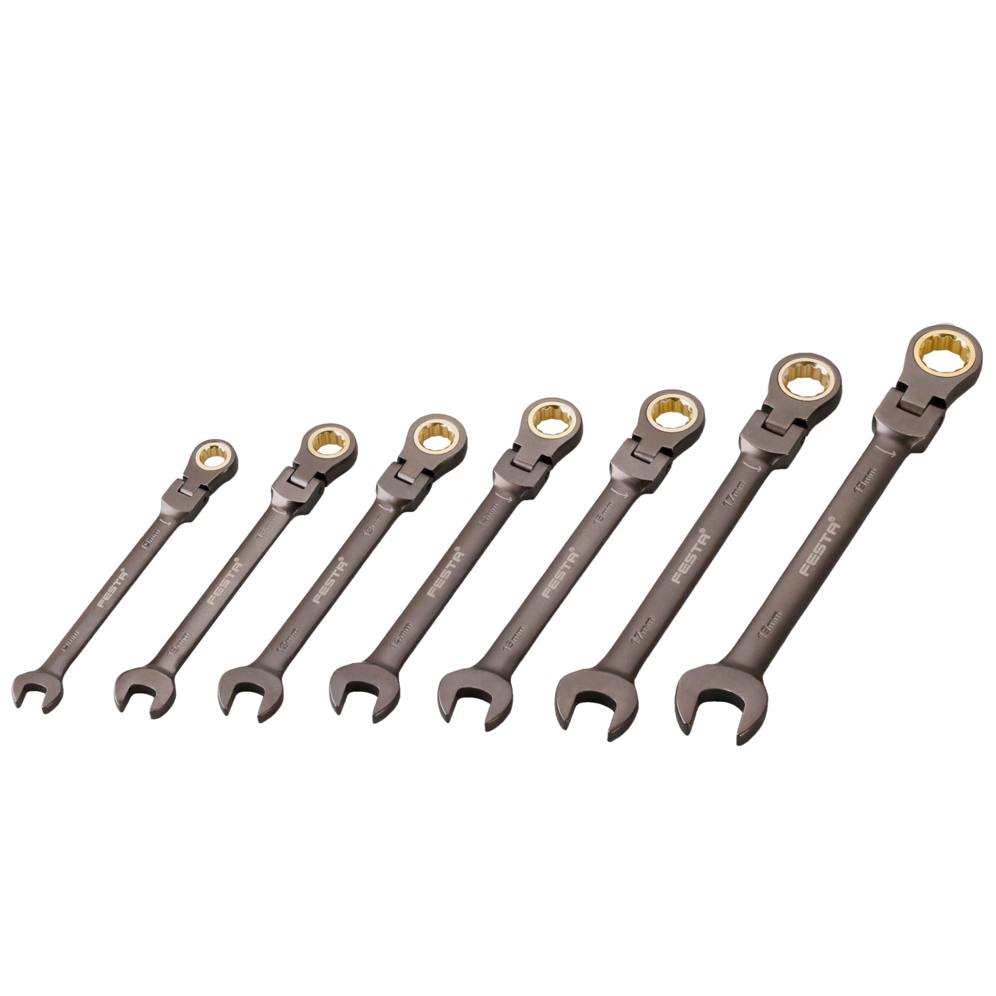 Ráčnové očkoploché klíče jsou ruční nástroj určený pro utahování či povolování šroubů a matic bez nutnosti přendávání klíče. Tyto klíče jsou vyrobeny kováním z vysoce kvalitní CrV oceli.Díky 72 kaleným zubům je ráčnový mechanismus velmi přesný a výkyv klíče na jednom zubu je pouhých 5°. Kloub umožňuje použití klíče v různých polohách. Nechte ruku, ať si sama najde nejpohodlnější polohu.Rozměry klíčů:10 - 12 - 13 - 14 - 15 - 17 - 19 mmPočet zubů ráčny: 72Kloub:ANOMateriál:CrVOrganizér:plastový držák