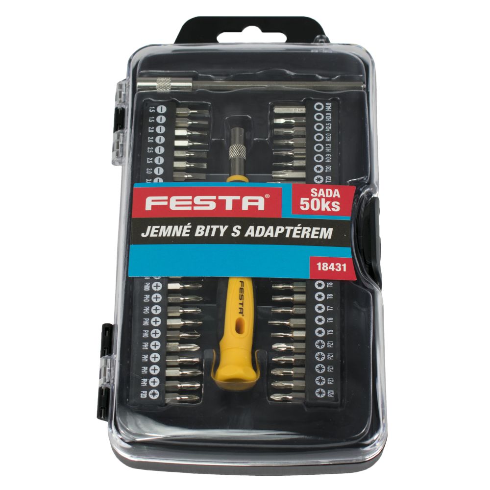 Sada kvalitních jemných bitů a adaptéru s plastovou pogumovanou rukojetí. Bity jsou vyrobeny z velmi kvalitní oceli a jsou povrchově chráněným tvrdochromem. Ergonomická rukojeť je vyrobená z kombinace polypropylenu a pryže, zaručuje dobré antiskluzové vlastnosti. Počet v sadě:50 kusůŠroubováky ploché:1,5 - 2 - 2,5 - 3 - 3,5 mmŠroubováky PHILIPS:PH000 - PH00 - PH0 - PH1Šroubováky POZIDRIVE:PZ0 - PZ1Šroubováky TORX:T5 - T6 - T7 - T8 - T9 - T10 - T15 - T20Šroubováky IMBUS:H0,9 - H1,3 - H2 - H2,5 - H3 - H4 mmExtra:prodloužení