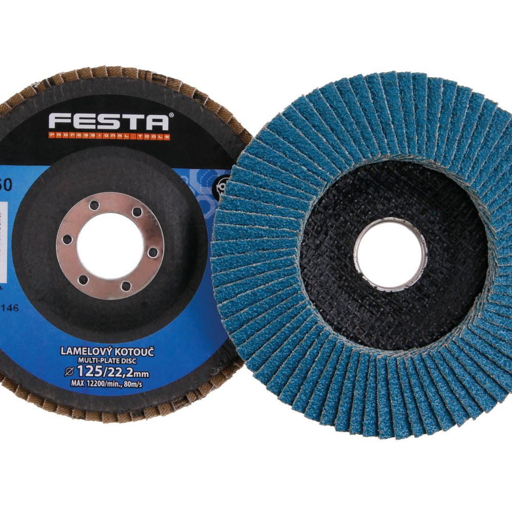 Lamelový kotouč FESTA 125 mm P 60 – výkonné brusivo pro ocel a nerezHledáte kvalitní lamelový kotouč pro efektivní broušení kovových materiálů FESTA 125 mm P 60 je profesionální lamelový kotouč se zrnem z oxidu zirkoničitého, který zaručuje vysoký úběr materiálu, dlouhou životnost a konzistentní výkon i při náročném použití.Díky šikmému tvaru lamel se kotouč snadno přizpůsobí povrchu a umožní precizní broušení i v hůře přístupných místech. Sklolaminátový nosič zajišťuje pevnost, nízkou hmotnost a bezpečnou práci. Oxid zirkoničitý má samoostřící efekt, takže si brusný kotouč zachovává vysokou účinnost po celou dobu používání.Výhody lamelového kotouče FESTA P 60:> Zrno z oxidu zirkoničitého – vynikající brusný výkon a dlouhá životnost > Samoostřící efekt – stálý výkon bez ztráty účinnosti > Šikmé lamely – lepší přístup k hranám a tvarovaným plochám > Odolný sklolaminátový nosič – stabilita, bezpečnost a pohodlná manipulace > Univerzální použití – ideální na ocel, nerez, litinu i titanPoužití:> Broušení a opracování oceli, nerezu, litiny a titanu > Odstraňování rzi, okují a starých nátěrů > Opracování svarů, hran a velkých ploch Vsaďte na kvalitu značky FESTA a vyberte si lamelový kotouč 125 mm P 60 pro profesionální výsledky a efektivní práci!