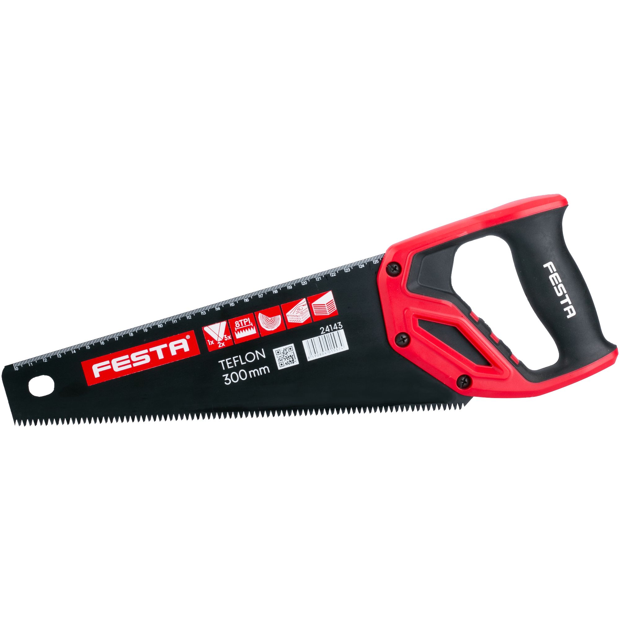 Ruční pilka pro jednoruční řezání dřeva. Pila je tvořena velmi pevným a stabilním listem pro maximální přenos síly na ozubené ostří. K pile je dodávám magnetický kryt ostří. Ostří se skládá z indukčně kalených, trojbroušených a tvrzených zubů. Tato kombinace zajišťuje rychlé a přesné řezání oběma směry. Pila je opatřena plastovou, ergonomicky tvarovanou rukojetí, měkčenou TPR gumou. Rukojeť má orientační označení úhlů 45° a 90°. Délka ostří: 300 mm Počet zubů: 7 na palec Tvrdost zubů: 47 - 52 HRC Hmotnost pily: 284 g
