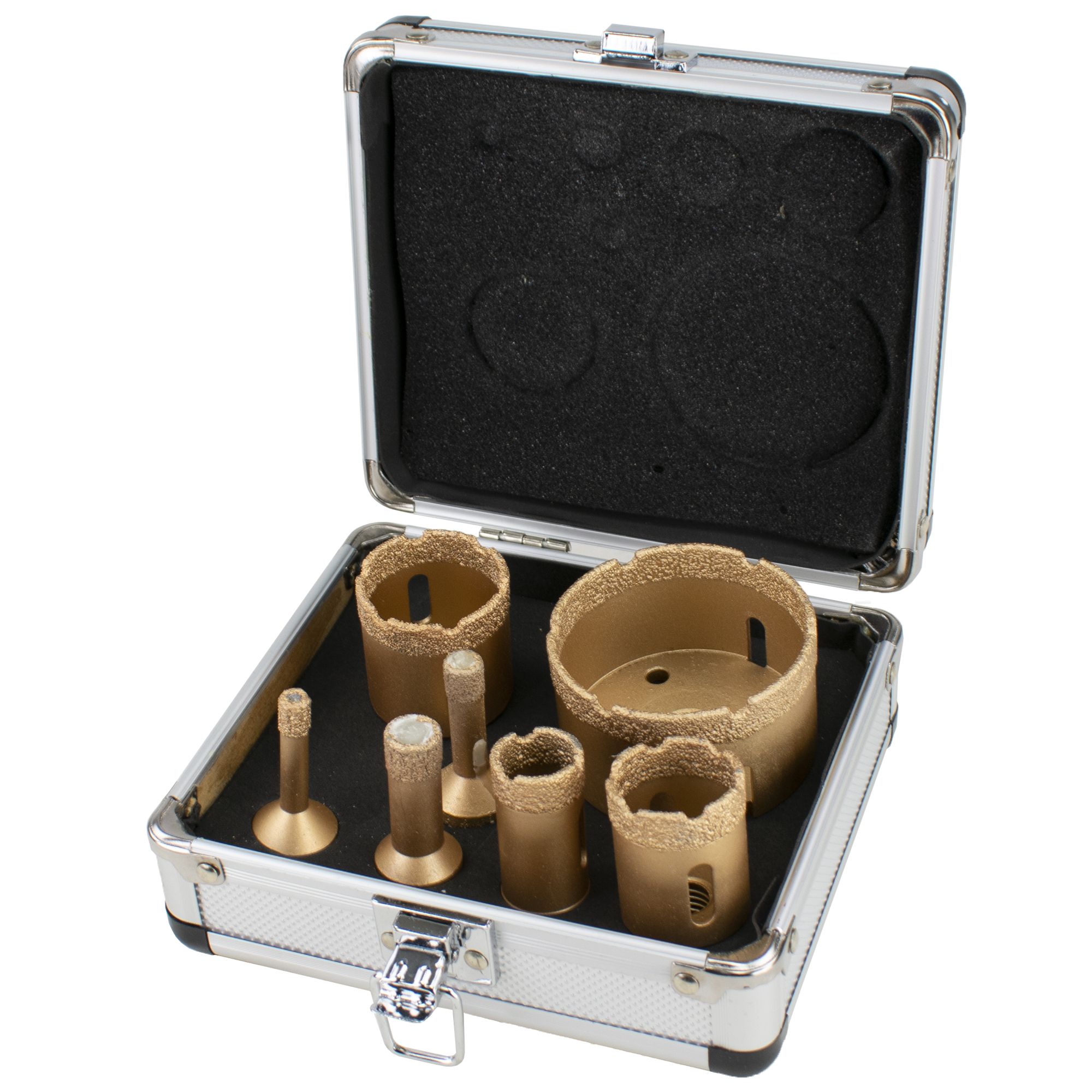 Sada vykružovacích korunek s ostřím z diamantového prachu. Tyto vykružováky jsou určené na vrtání kamene, keramické dlaždice, mramor, žulu a na většinu stavebních materiálů.Tyto korunky jsou určené pro použití v úhlové brusce a pro suché vrtání. Korunky nejsou opatřeny vodícím vrtákem a vykružování otvoru tak musí probíhat postupně. Nejprve se "zakousne" hrana pod úhlem cca 45° a následně se korunka srovná kolmo k materíálu a dořezává se celý otvor.Sada je dodávána v praktickém a pevném hliníkovém kufříku. Průměry korunek:8 - 10 - 14 - 22 - 32 - 40 - 68 mmUchycení (upínání):závit M14 - úhlová bruskaHloubka korunek:50 mmMateriál břitu:diamantový prachŠířka břitu:10 mm (výška diamantu)Nutnost chlazení:NEStředový vrták:NEMaximální otáčky:-