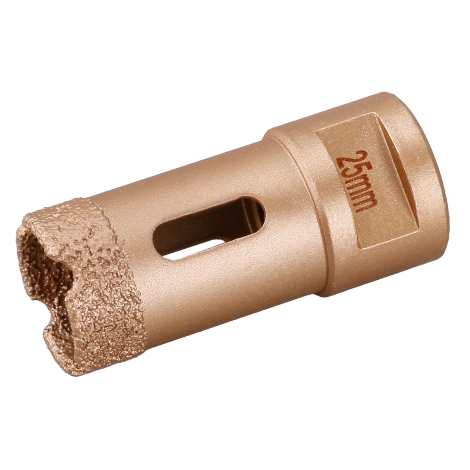Vykružovací korunka s ostřím z diamantového prachu. Tyto vykružováky jsou určené na vrtání kamene, keramické dlaždice, mramor, žulu a na většinu stavebních materiálů.Tato korunka je určena pro použití v úhlové brusce a pro suché vrtání. Korunka není opatřena vodícím vrtákem a vykružování otvoru tak musí probíhat postupně. Nejprve se "zakousne" hrana pod úhlem cca 45° a následně se korunka srovná kolmo k materíálu a dořezává se celý otvor.