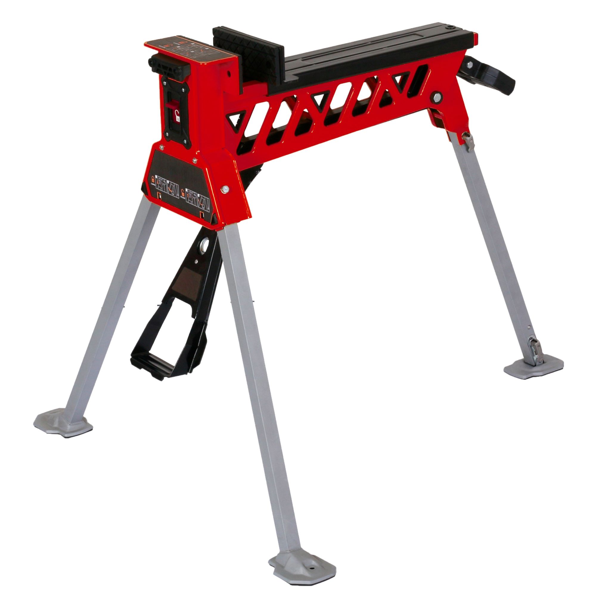 Přenosný stojanový svěrák s vysokou nosností. Ideální pomocník pro velké spektrum profesí. Stojan umožňuje jednoduché, rychlé a pevné upnutí trámů, trubek, desek a podobně. Svěrák s nožním ovládáním umožňuje upnutí břemene i bez použití rukou ( držíte břemeno oběma rukama ) a navíc velkou silou. Rozsah svěráku má dva stupně a umožňuje upnout téměř metrové břemeno. Stůl je možné používat jako podpěru ( tkz. kozu ) s vysokou nosností. Stojanový svěrák lze během několika sekund poskládat do kompaktního rozměru pro pohodlné přenášení a skladování. Celková nosnost:250 kgMax. rozevření čelistí:95 cmCelkové rozměry:107 x 98 x 89 cmRozměry složeného stolu:81 x 30 x 35 cmUpínací síla:10 000 N (1000 kg)Posun čelistí ( jeden krok ):2,4 cmHmotnost:19 kg