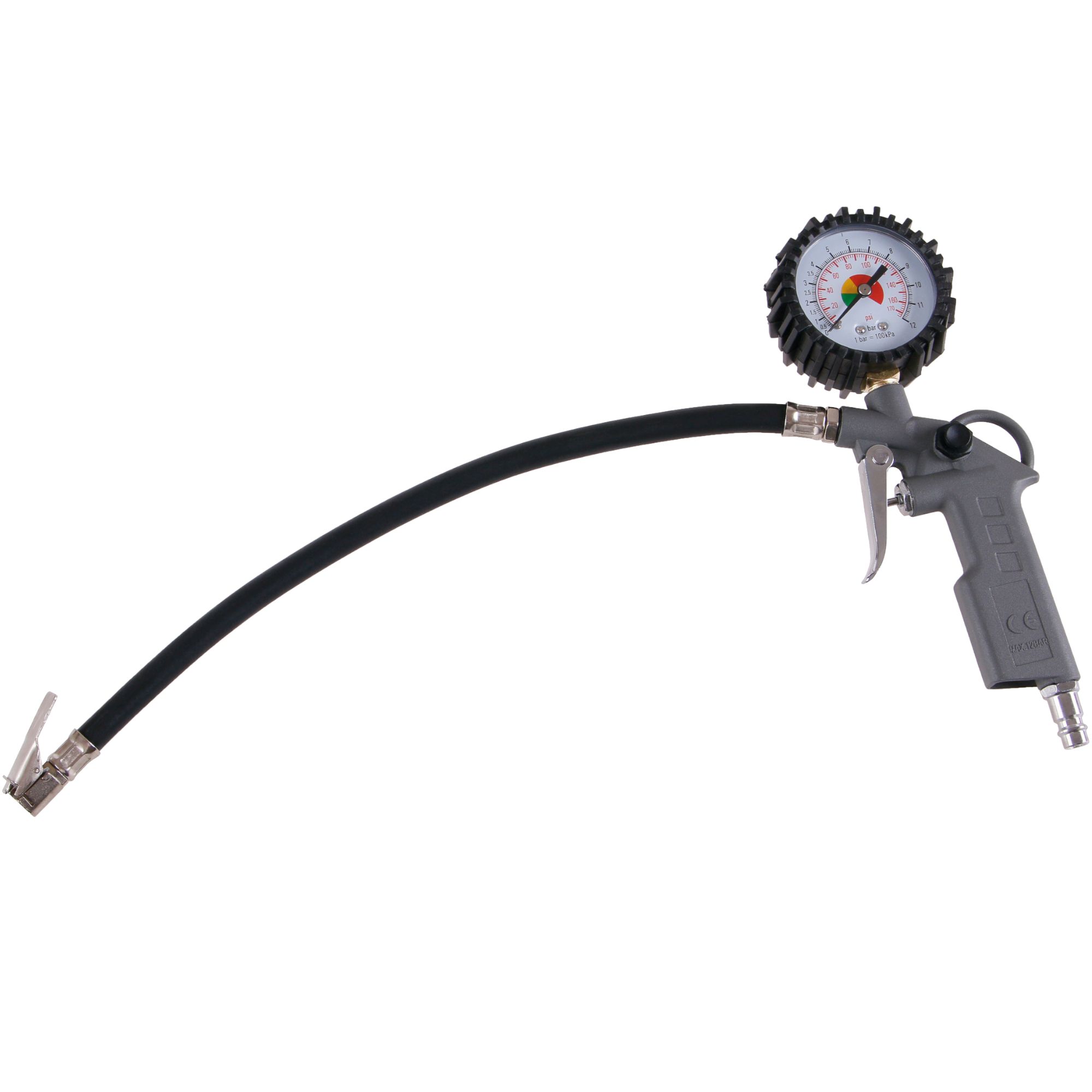Klasický plnič pneumatik s analogovým manometrem. Plnič je určen k huštění stlačeným vzduchem přes autoventilek ( auta, motorky, kola a pod. ), nebo přes různé redukce např. míče, nafukovací lehátka a další. Plnič je opatřený také zpětným ventilem pro případné odpouštění tlaku.Max. pracovní tlak:12 bar Rozsah měření:0 - 12 barMěřící jednotky:psi, barTyp koncovky:vsuvka do rychlospojky 1/4"Průtok vzduchu:110 - 200 l/minSada redukcí:NE