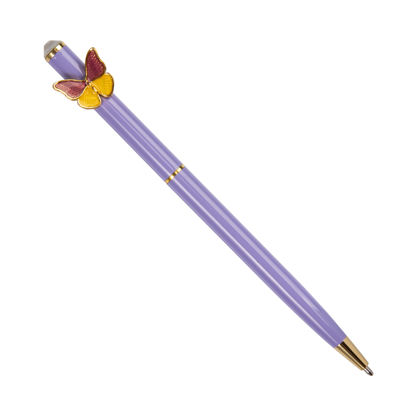 Fialová propiska s okrasným motýlkem a kamínkem na vršku. Propiska se otevírá praktickým otočením spodní části a dobře padne do ruky. Barva inkoustu: modrá
