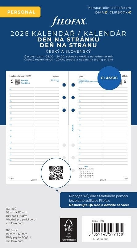 FILOFAX kalendář 2026 osobní, den/1 str, linky, ČJ+SJ