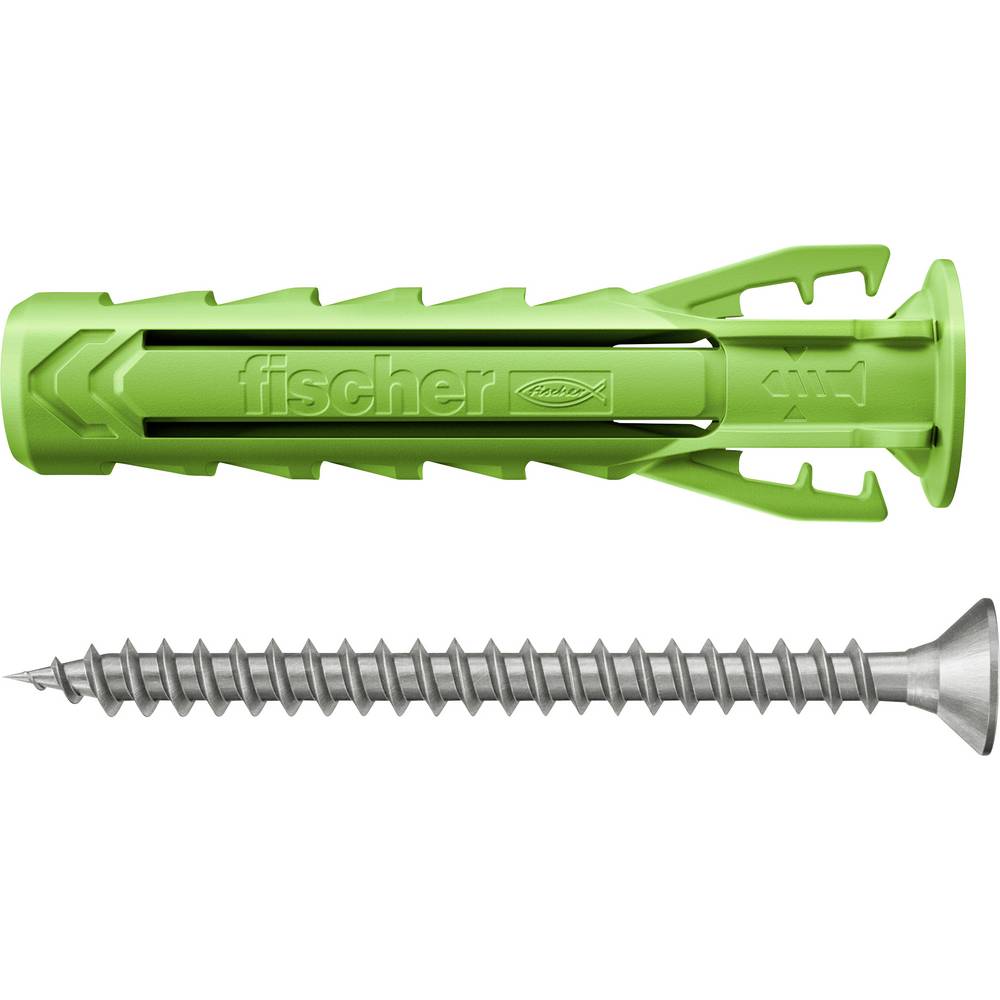 fischer rozpěrná hmoždinka SX Plus Green je vyrobena z nejméně 50 % obnovitelných surovin. Díky 4-násobnému roztažení je specialistou na plně stavební materiály jako beton, vápencový pískovec a zdivo.
