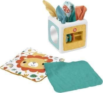 Zábavná kostka na kapesníky, se kterou si dítě rozvíjí jemnou motoriku a logické myšlení. Dítě si může vybrat 6 látkových čtverečků, podívat se do zrcadla nebo mnoho jiného. Rozměry kostky jsou 12 cm.