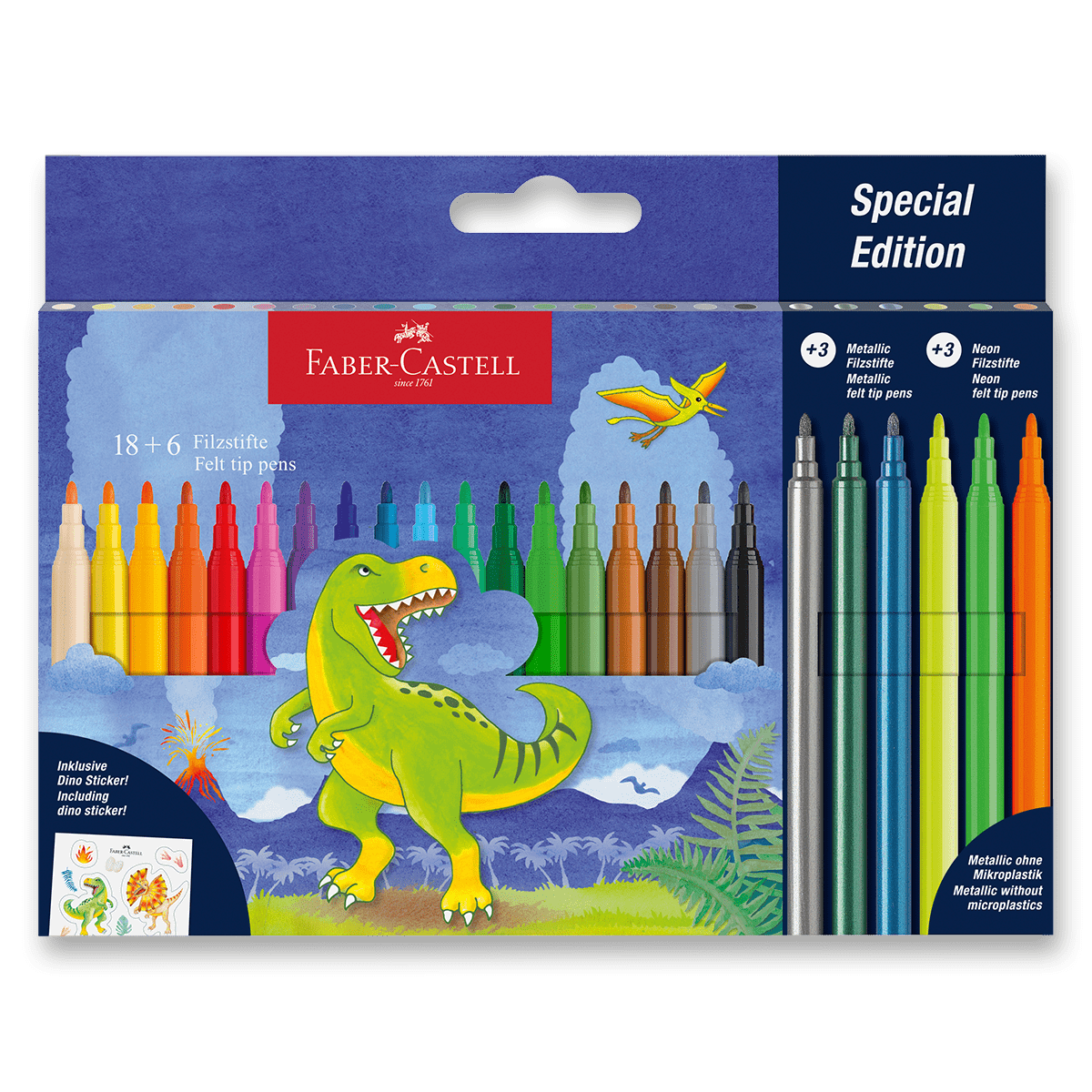Souprava 24 kusů (18+6) fixů Faber-Castell Dinosarus s tématikou dinosaura. Fixy mají brilantní barvy a silný hrot, odolný proti nešetrnému zacházení. 18 ks fixů ve standardních barvách, 3 ks fixů v metalických barvách se zářivým efektem, 3 ks fixů v neonových barvách, ideální ke kreslení na papír, karton, dřevo atd., sada samolepek s motivem dinosaura, ventilační víčko, intenzivní barvy, vypratelné z většiny běžných textilií při 30 °C Zakupte produkt Fixy Faber-Castell Dinosaurus, 24 barev z kategorie Psací potřeby | Fixy | Sady od výrobce Faber-Castell za cenu 169 Kč.